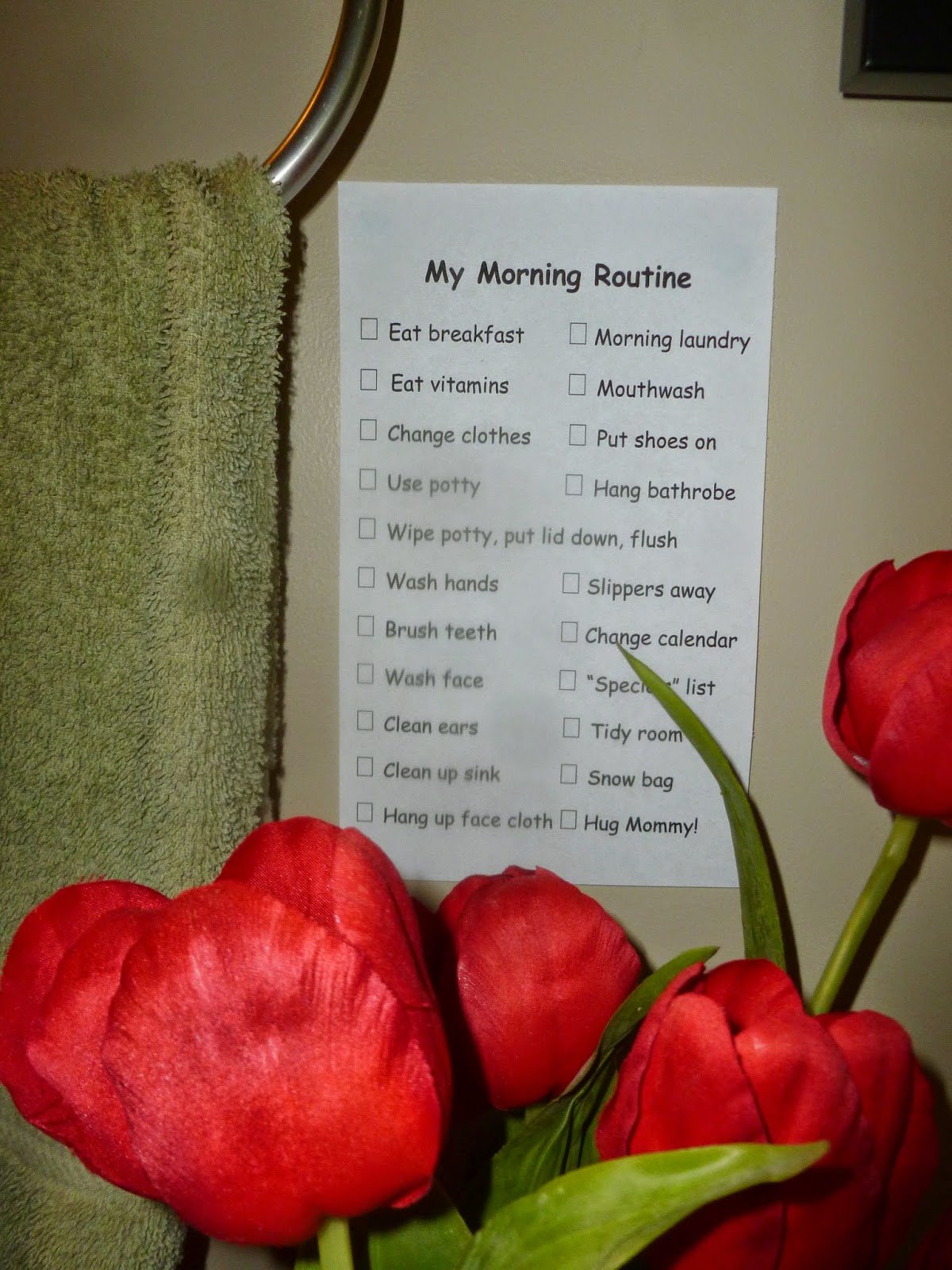 I’m a huge “list person” with lists for the day, week, season and year. I also created a checklist for my kids to cut down on the chaos of getting ready in the morning. Their checklist is actually laminated and hangs in the bathroom where they get ready. It has helped them become more independent, and has completely saved my sanity! The final item on the list is “hug mommy.” It is a wonderful way to transition from “work” to “free time” before the school bus comes, or before we head out together for the day.