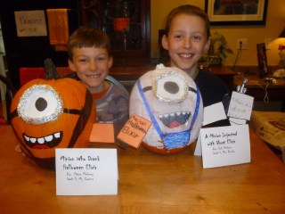 So I volleyed the idea: What if Zack morphed his ghost pumpkin into a Minion “who drank a ghost elixir?” Immediately Mason jumped on board, convincing Zack that it was possible. Zack felt his brother’s love and support, and turned a corner. The pumpkin remodeling turned into a family affair: Zack worked on the eye, Mason worked on the arm, I fired up the glue gun, and Jocelyn danced and sang her encouragement in the background. My husband further supported the cause by making breakfast, and agreeing to drive the boys to school to buy more time and help transport the pumpkins.