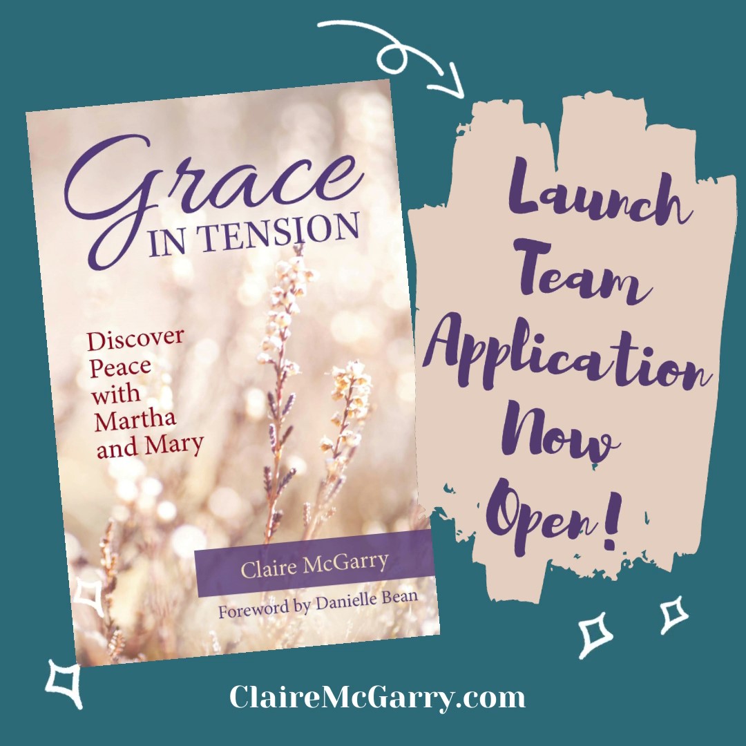 I’m excited to announce I’m assembling a Launch Team for my new book, Grace in Tension: Discover Peace with Martha and Mary. Any and all help you can provide will be immensely appreciated and invaluable in getting the word out. My goal is to get this book into as many hands as possible to help readers transform their stress and tension into grace, and draw closer to God. Your effort and influence will be instrumental in reaching that goal.