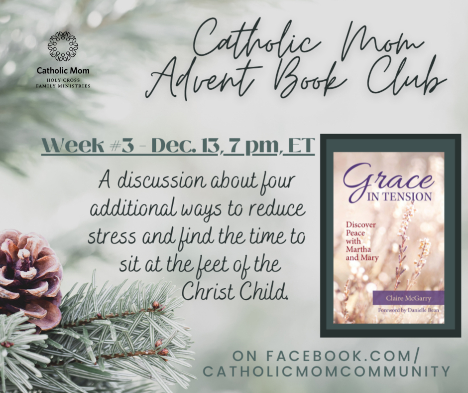 Join me Monday, Dec. 13th, live at 7 p.m. ET on https://www.facebook.com/CatholicMomCommunity for Session 3, the last session of the Grace in Tension Catholic Mom Advent Book Club. We’ll talk about four additional ways to reduce stress so we can find the time to sit at the feet of the Christ Child.